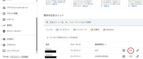 ちなみに一度閉じてしまっても、先ほどの「広告ユニットごと」画面の下の方に、作成した一覧が出てくるので、そこのこのマーク↓をクリックすると同じコードが表示されます。