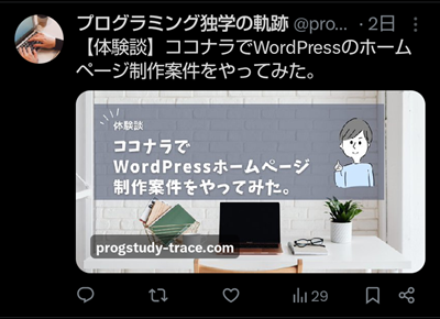 ただ私がやってみたときは、Xでシェアした時はOGP画像が表示されなかったのですが、時間が経ってからそのポスト(ツイート)を見てみると、ちゃんと画像が大きく表示されてました。