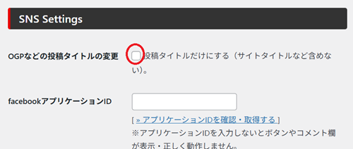 さらに下の方の「SNS Setting」の「OGPなどの投稿タイトルの変更」のところ↓