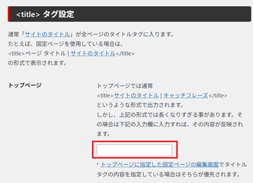 タイトルは何も入力しないと、「ページタイトル|サイト名」の形式で出力されます。基本的にはそのままで(入力しなくて)いいと思います。
