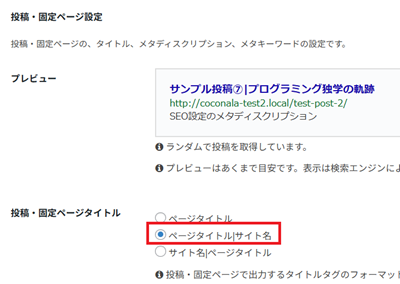さらにその下の「投稿・固定ページタイトル」は「ページタイトル|サイト名」がおすすめです↓。