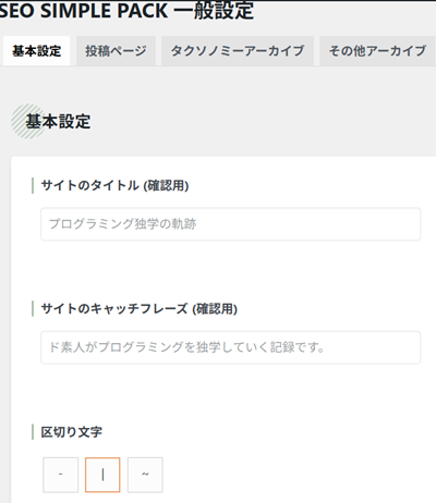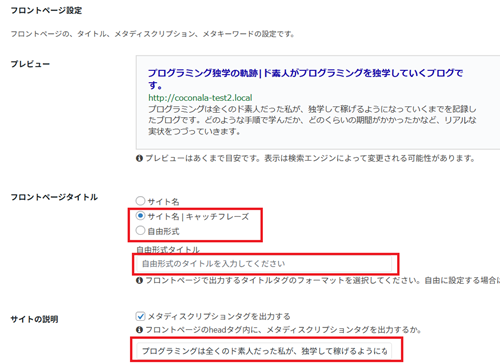 「フロントページのタイトルタグ」も基本的にそのままでいいです。そのままだと「サイト名|キャッチフレーズ」という形式で出力されます。