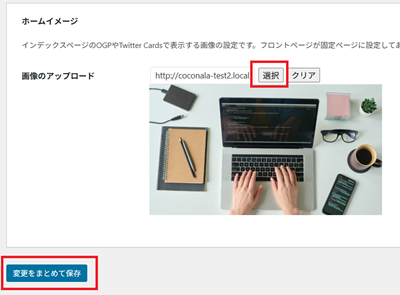 その下の「ホームページイメージ」に、トップページがシェアされた時の画像をアップしておいてください。サイトのイメージ画像やロゴ画像などがいいでしょう↓