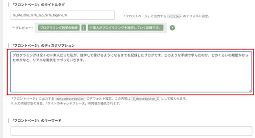 「フロントページのディスクリプション」のところが重要で、ここに70~120文字程度で、キーワードを含めてサイトの説明文を書きましょう。