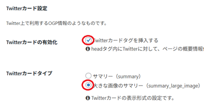 その下のTwitterカード設定は「Twitterカードタグを挿入する」と「大きな画像のサマリー」にチェックを入れてください↓