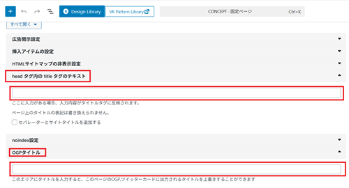 タイトルは下の方の「headタグ内のtitleタグのテキスト」から、あとOGPタイトルも入力できます↓