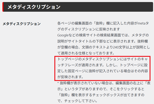 その下に書いてありますが、トップページのメタディスクリプションは「設定」→「一般」のキャッチフレーズに入力したものが反映されます↓
