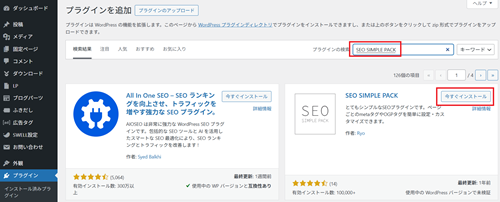 プラグイン検索のところで「SEO SIMPLE PACK」と検索し、出てきたやつを「今すぐインストール」↓