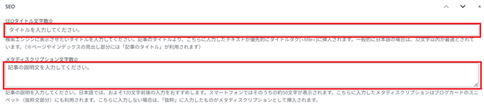 タイトルは何も入力しないと、先ほど「投稿・固定ページタイトル」で設定した「ページタイトル|サイト名」の形式で出力されます。基本的にはそのままで(入力しなくて)いいと思います。