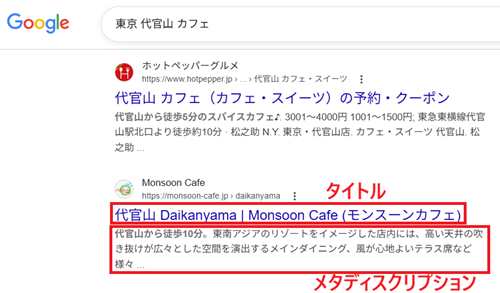 タイトル(head内のtitleタグに出力される部分)とメタディスクリプション(説明文)は検索結果に表示される部分であり、ユーザーがクリックするかどうか左右するポイントになります。