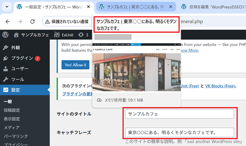 Lightningの場合、トップページのタイトルは「設定」→「一般」の「サイトのタイトル | キャッチフレーズ」という形式で出力されます↓