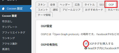次にCocoon設定の「OGP」→「OGPタグを挿入する」にチェックを入れます。