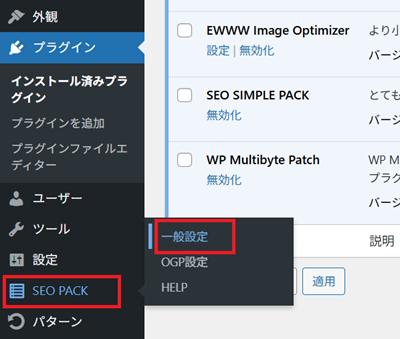 プラグインを有効化すると左側メニューに「SEO PACK」という項目が追加されるので、その「一般設定」↓