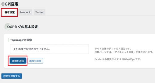 「基本設定」のところ、OGP画像をアップしてください。推奨画像サイズは1200×630pxです↓