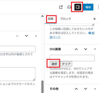 右側の「設定」→「投稿」→「SNS画像」のところに、OGP画像をアップするところがあります↓