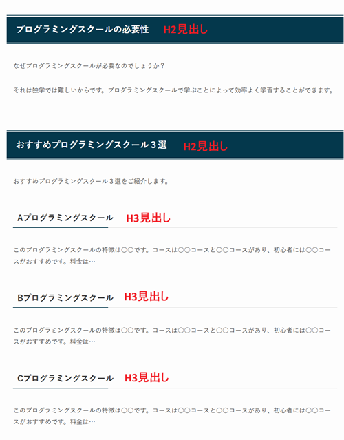見出しを入れることで見た目にもすっきりしますし、検索エンジンに何について書いてあるのかをより認識してもらえます。