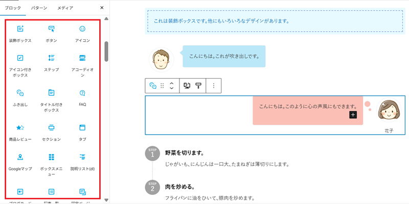 また、機能も充実していて、「装飾ボックス」や「吹き出し」、「ステップ」など、ブログやホームページ作りに必要なブロックが多数用意されています↓