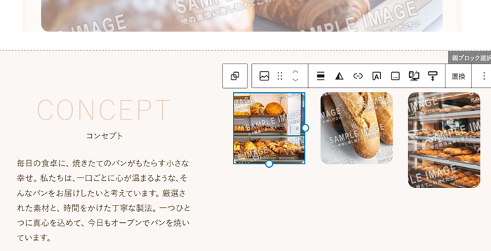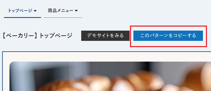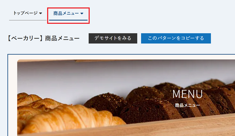 例えばベーカリーの場合、ここの↓「商品メニュー」をクリックすると商品メニューページのブロックパターンが出てきます。