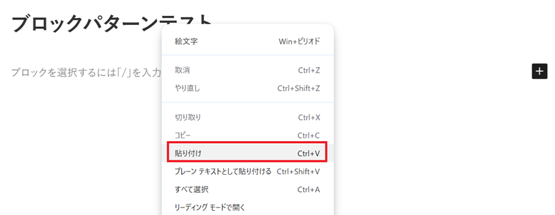そしたら自分のワードプレスに行き、固定ページ編集画面から、ブロックを追加→右クリック→貼り付け↓