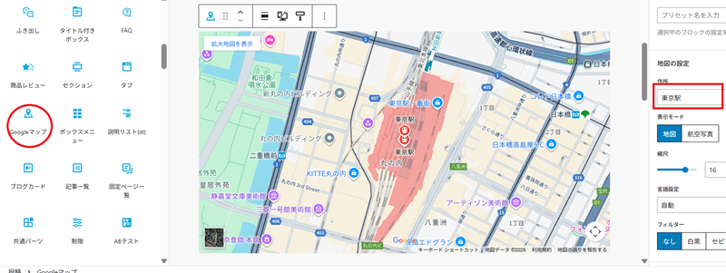 Googleマップは、住所や名称を入力するだけで地図が埋め込めます↓